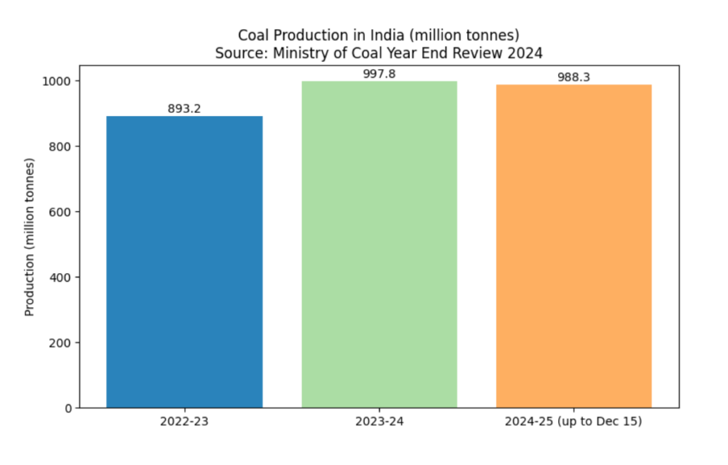 India’s coal production has accelerated in recent years to meet power demand. The bar chart below uses data from the Ministry of Coal’s 2024 Year‑End Review. It shows that production increased from approximately 893 Mt in 2022‑23 (calculated from the 11.71 % growth figure) to 997.826 Mt in 2023‑24 and reached 988.32 Mt by 15 December 2024.