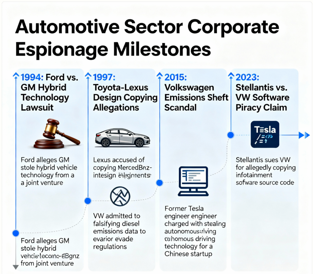 Infographic Timeline illustrating milestone cases of corporate espionage in the automotive sector