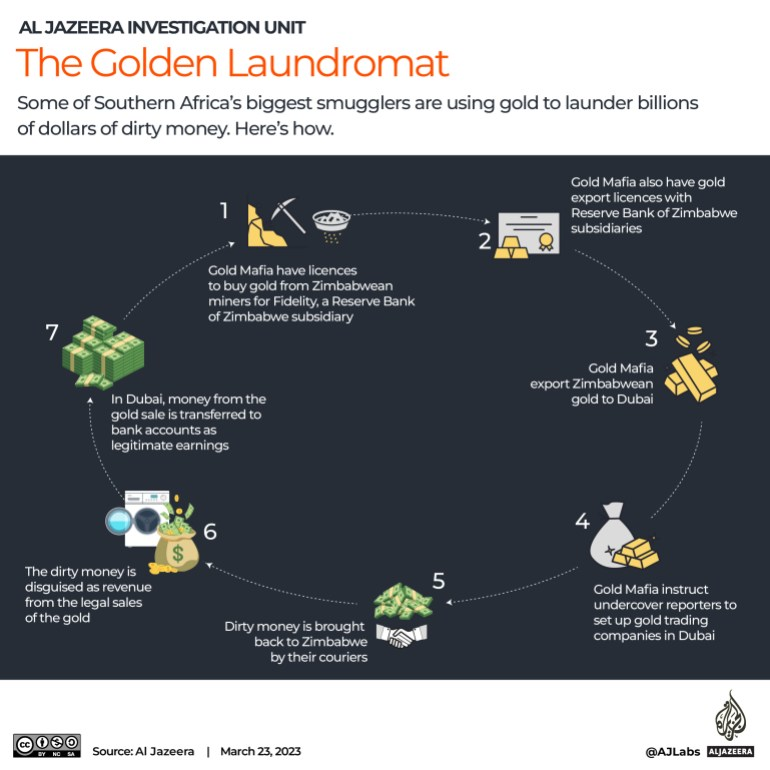 Al Jazeera’s Gold Mafia investigation exposed a seven-step cycle that begins with obtaining licenses to buy gold from Zimbabwean miners through Reserve Bank subsidiaries. The gold is then exported to Dubai, where trading companies are established to bring dirty money back to Zimbabwe through couriers. This money is disguised as legitimate revenue and transferred to Dubai bank accounts as clean earnings.
